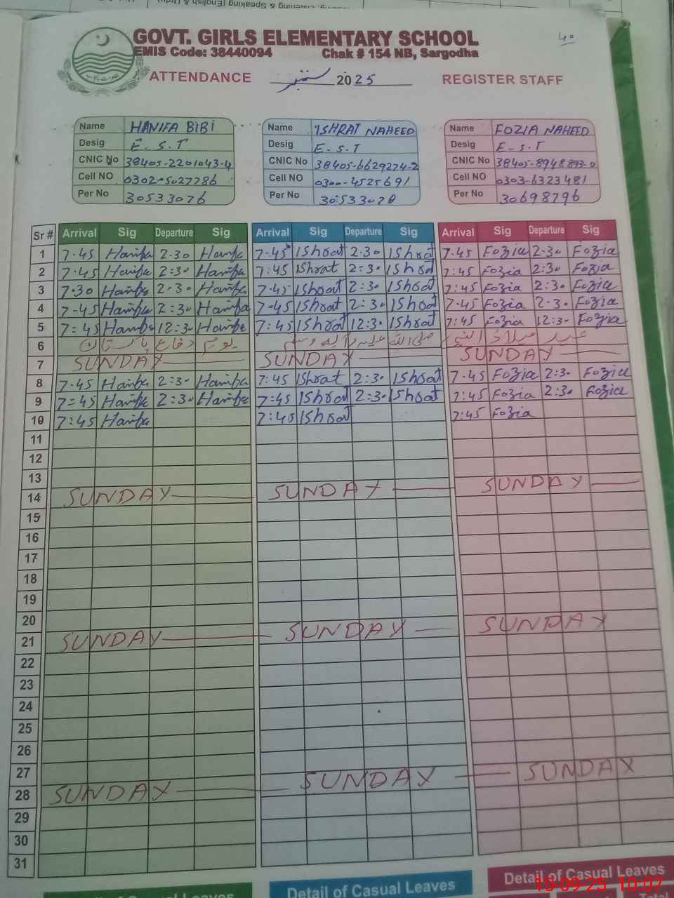 | CNIC | Full Name | Designation | R/C | Absence During Last Calender Month |
