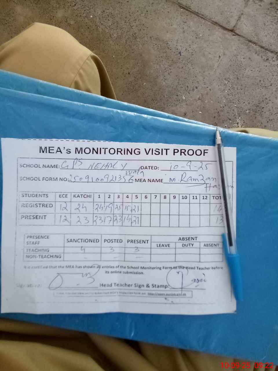 | Attendance Register | Head Teacher | MEA with School | Visit Proof |