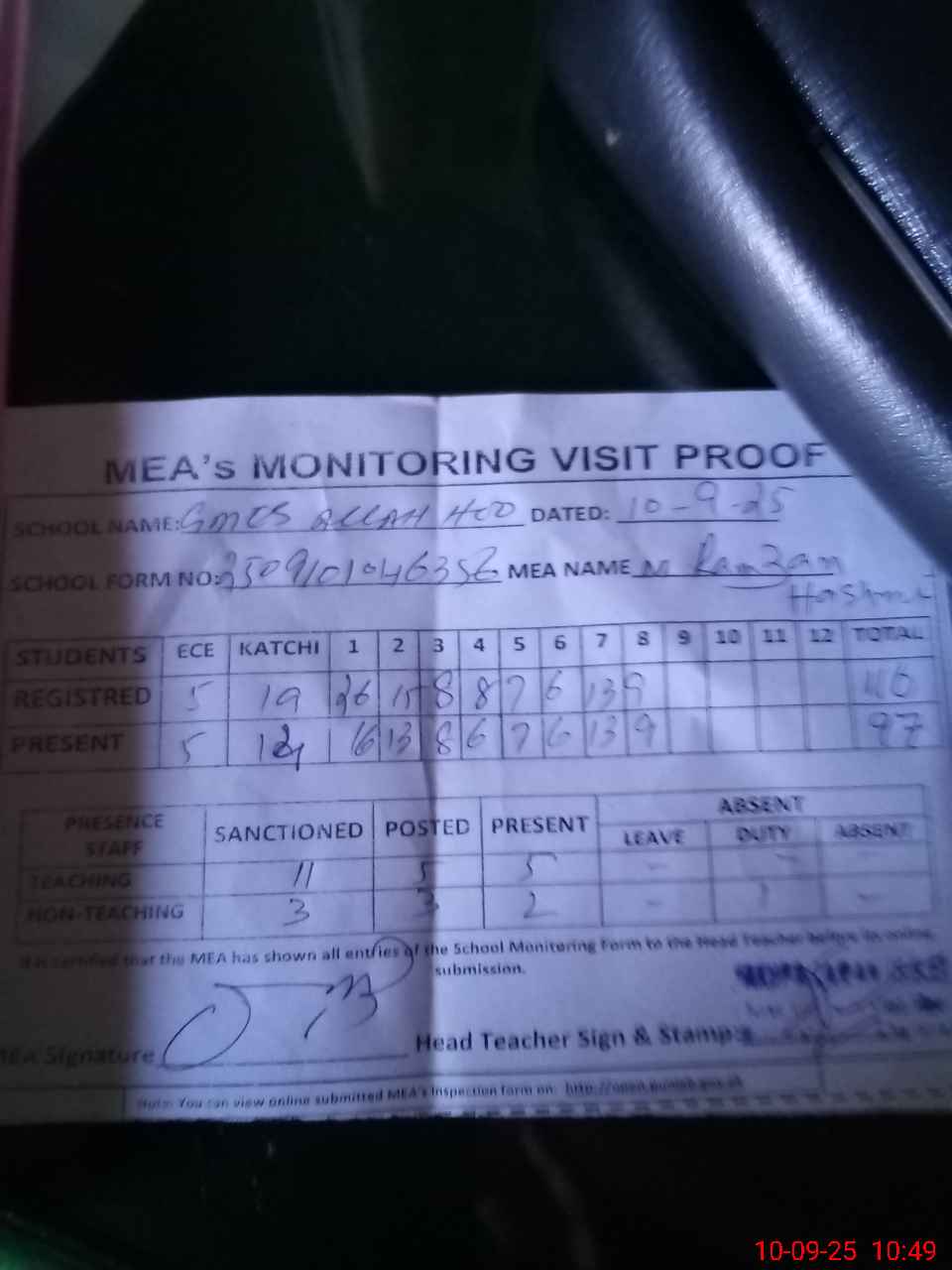 | Attendance Register | Head Teacher | MEA with School | Visit Proof |