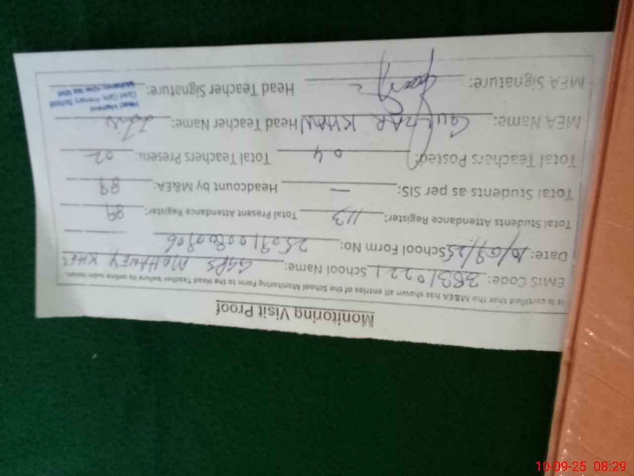 | Attendance Register | Head Teacher | MEA with School | Visit Proof |