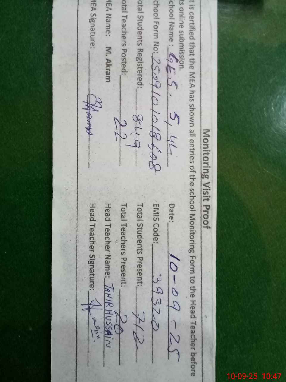 | Attendance Register | Head Teacher | MEA with School | Visit Proof |