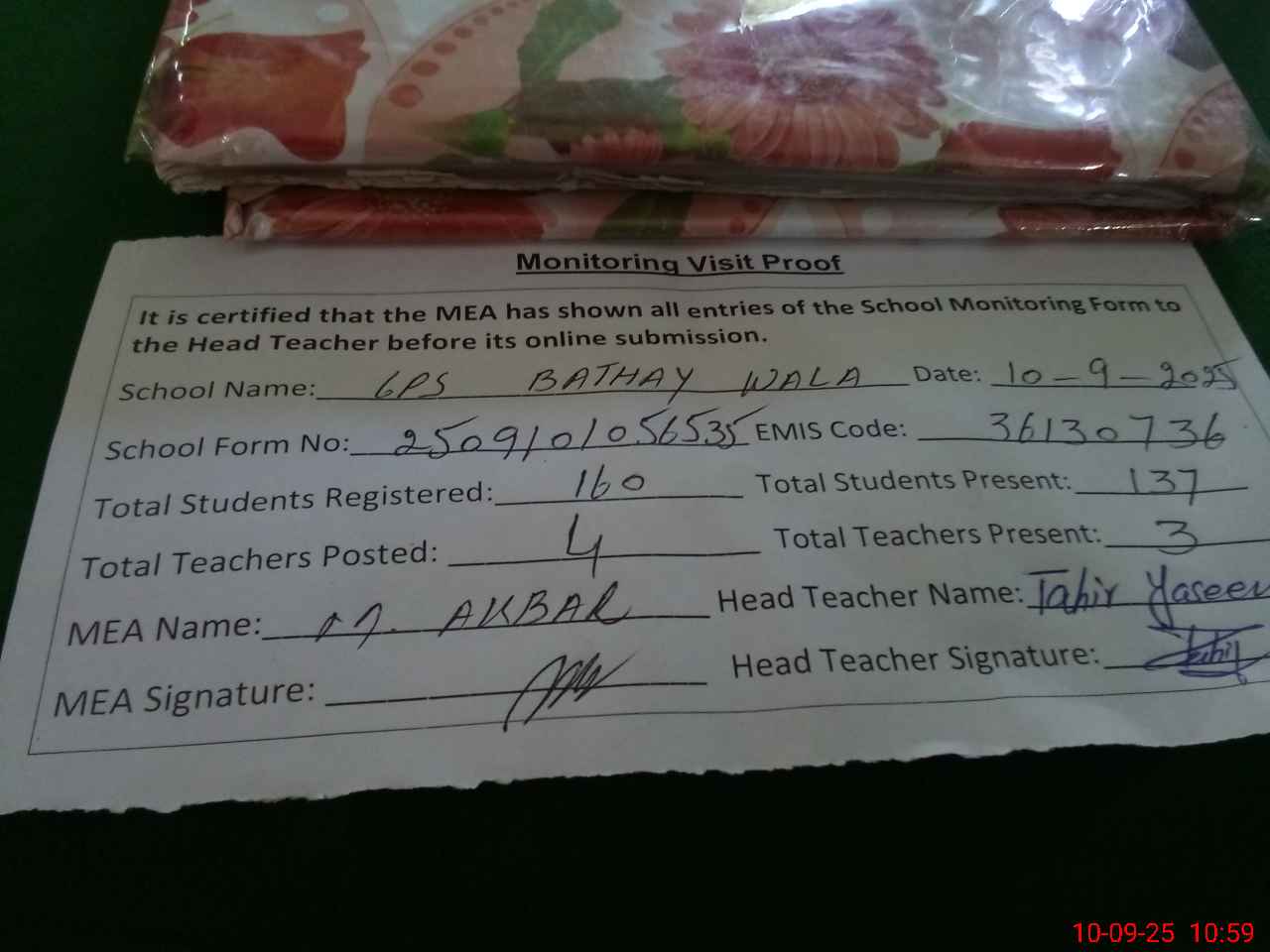 | Certified that this School was Inspected by the Undersigned MEA/DMO Today and the Information Stated Above is as Per Record. | |||||