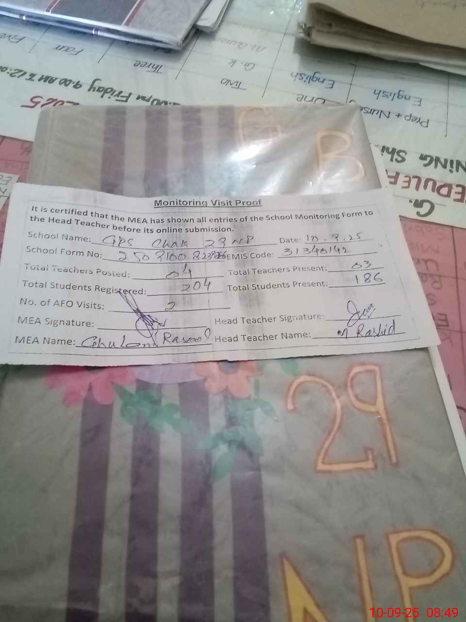 | EMIS Code: 31340142 | Name of School: GPS CHAK NO. 29/NP | |||