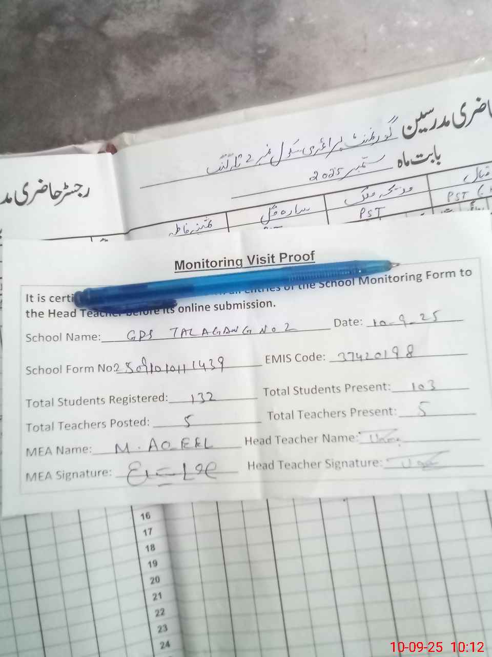 | Attendance Register | Head Teacher | MEA with School | Visit Proof |