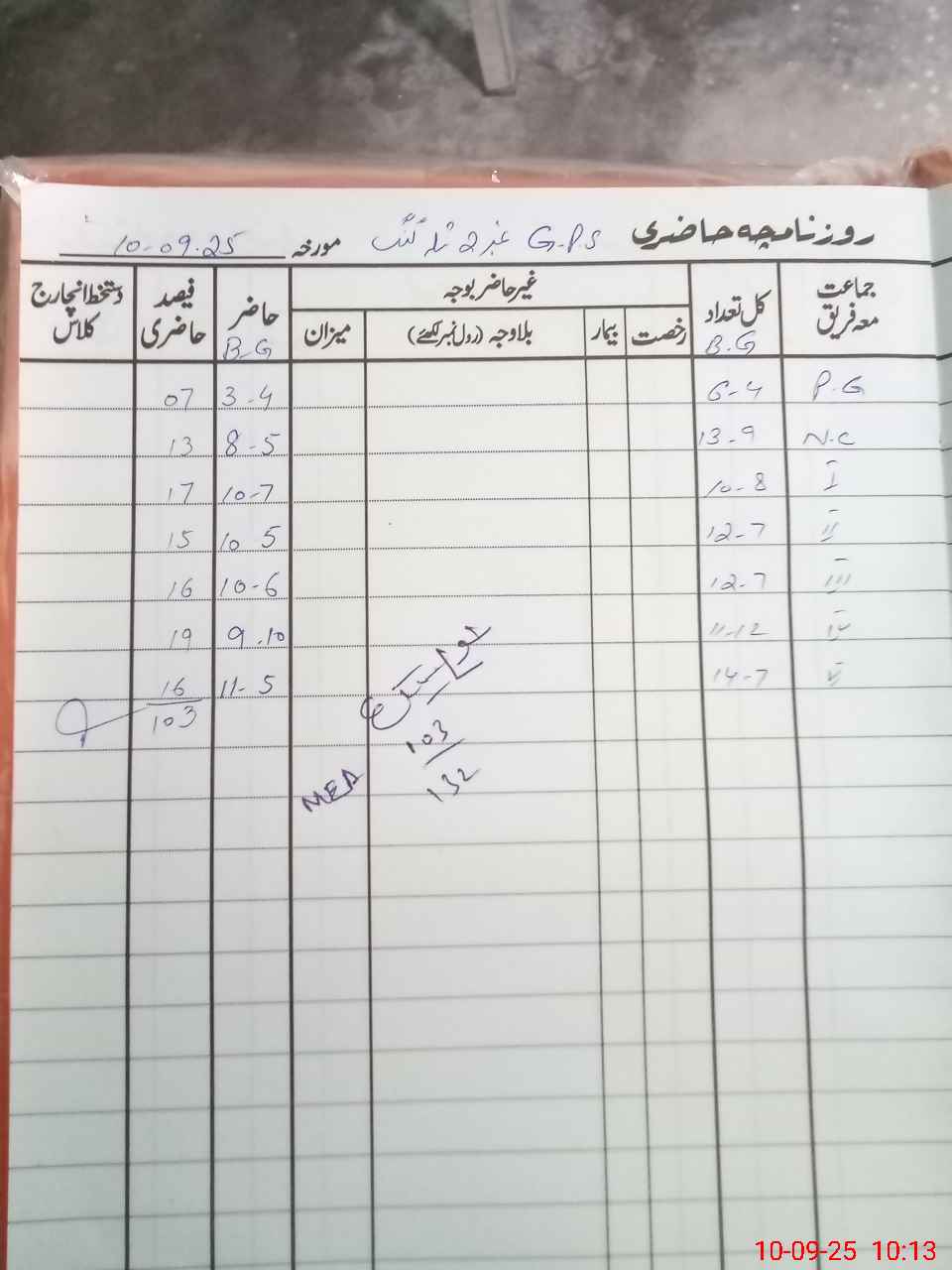 | Total Students Present | 7 | 0 | 13 | 17 | 15 | 16 | 19 | 16 | 103 | |||||||