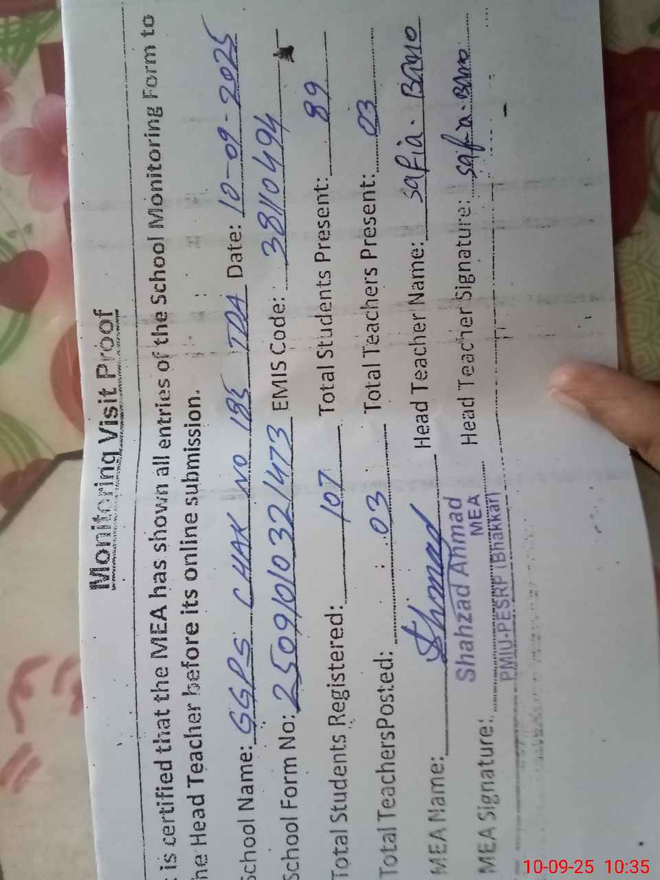 | Certified that this School was Inspected by the Undersigned MEA/DMO Today and the Information Stated Above is as Per Record. | |||||
