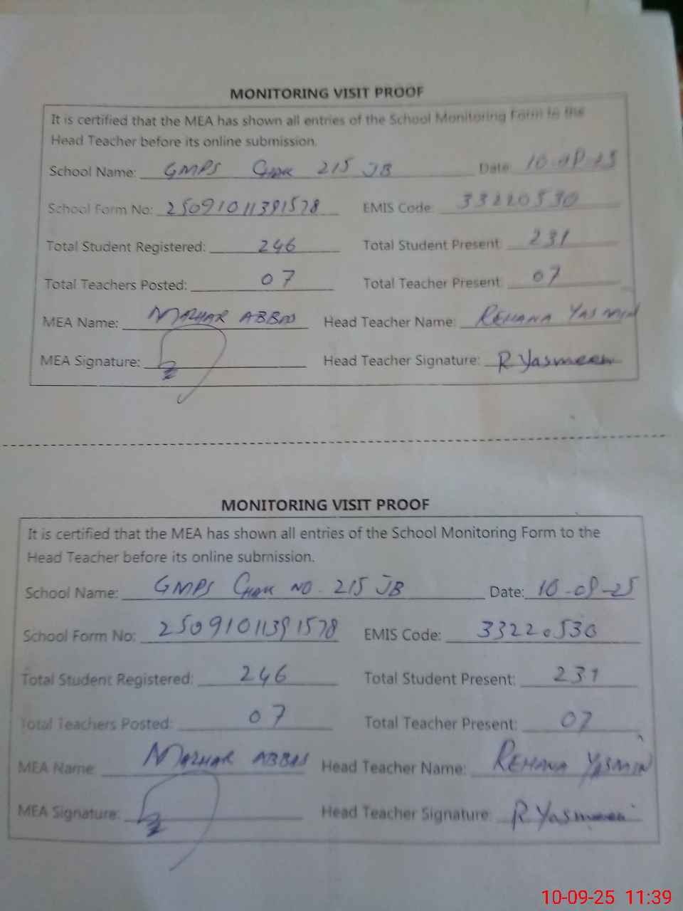 | Attendance Register | Head Teacher | MEA with School | Visit Proof |