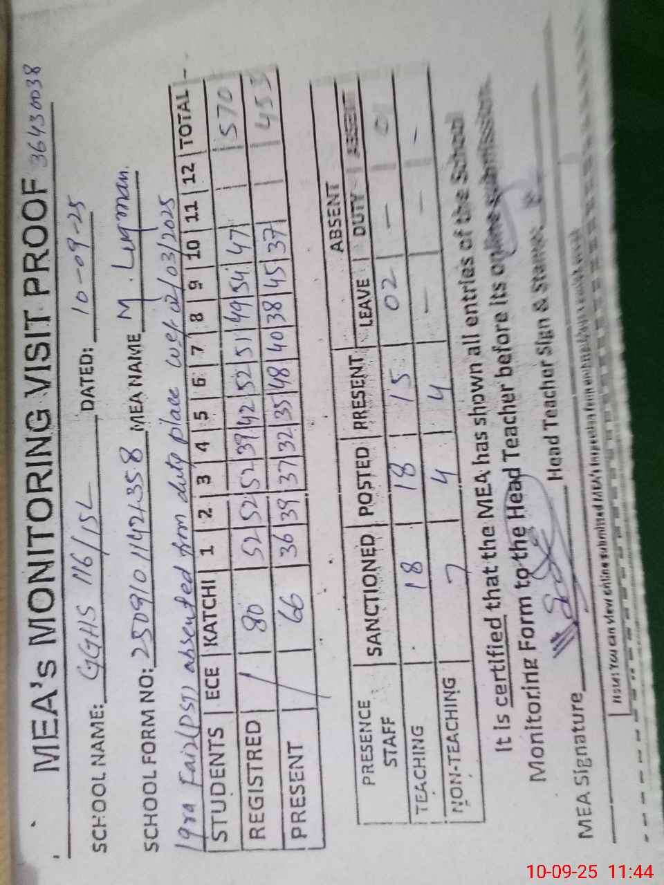 | Attendance Register | Head Teacher | MEA with School | Visit Proof |