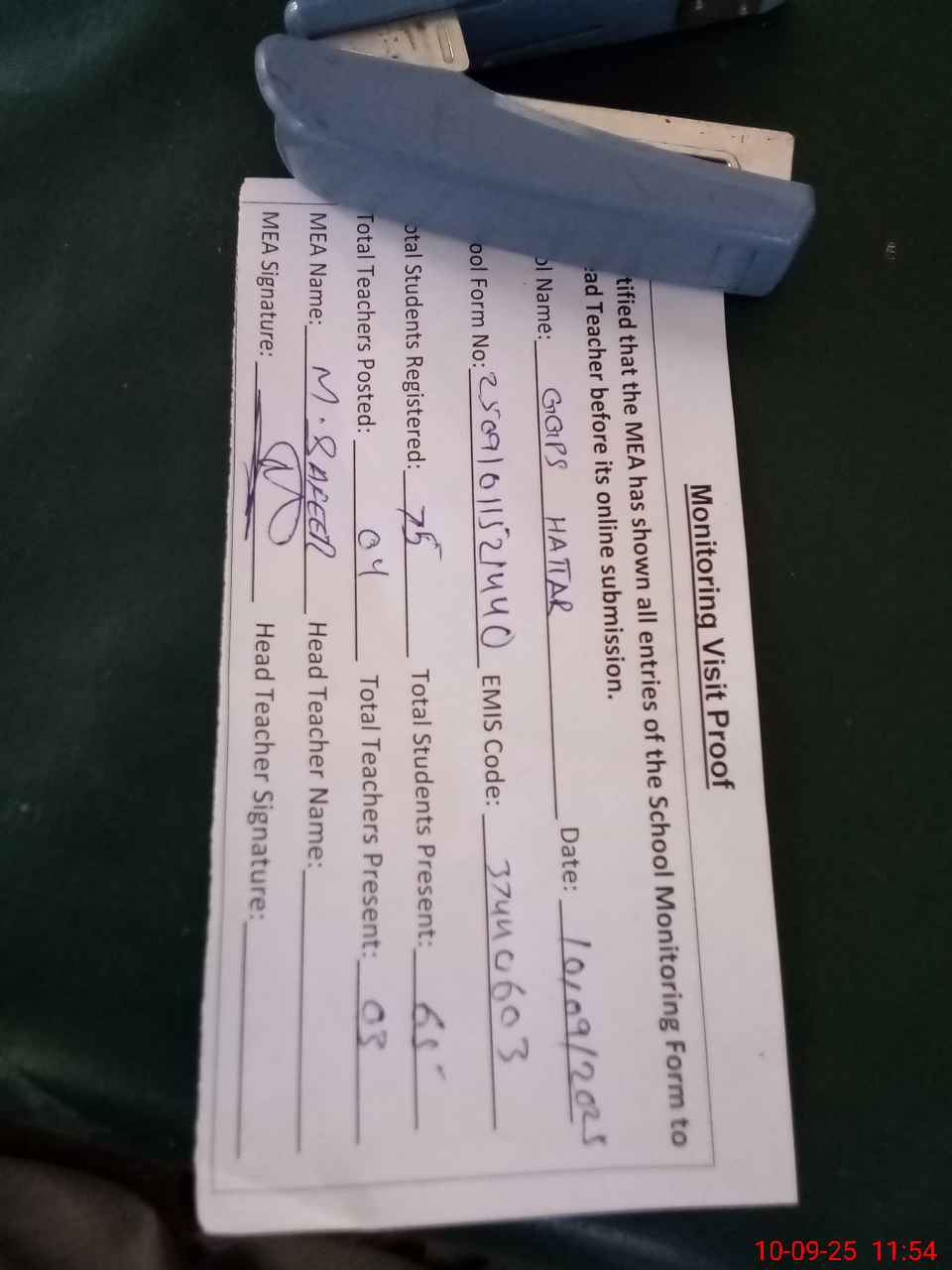 | Attendance Register | Head Teacher | MEA with School | Visit Proof |