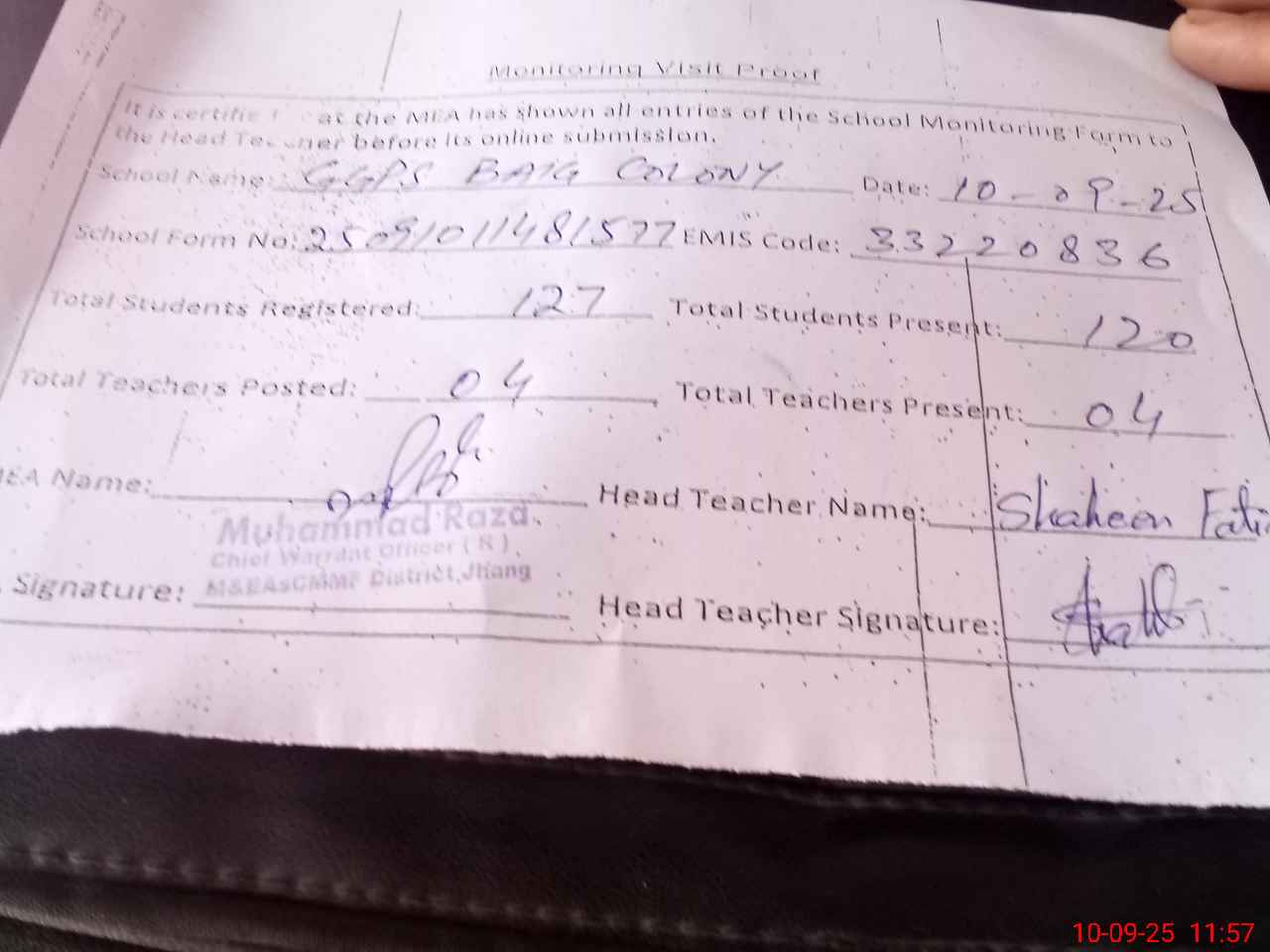 | Attendance Register | Head Teacher | MEA with School | Visit Proof |