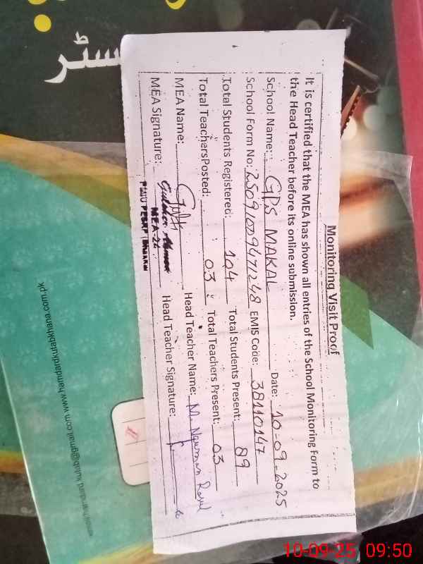 | Attendance Register | Head Teacher | MEA with School | Visit Proof |