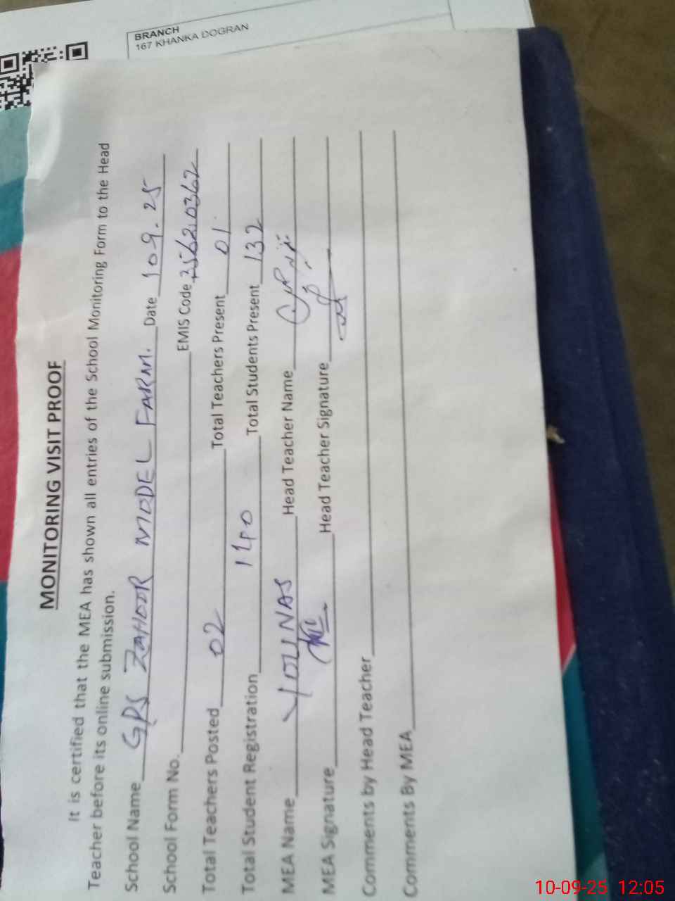 | Attendance Register | Head Teacher | MEA with School | Visit Proof |
