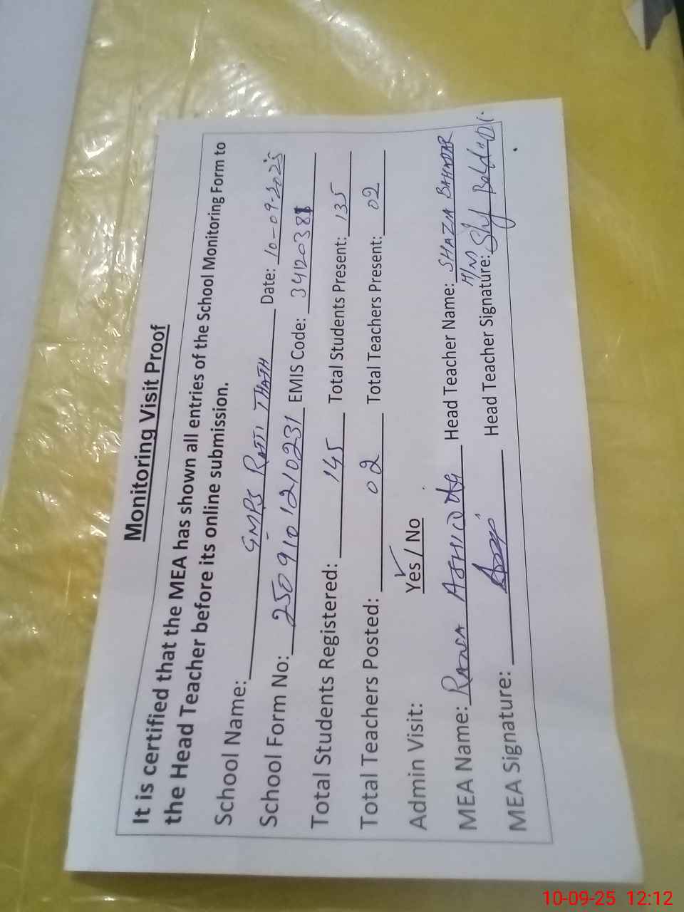 | Attendance Register | Head Teacher | MEA with School | Visit Proof |