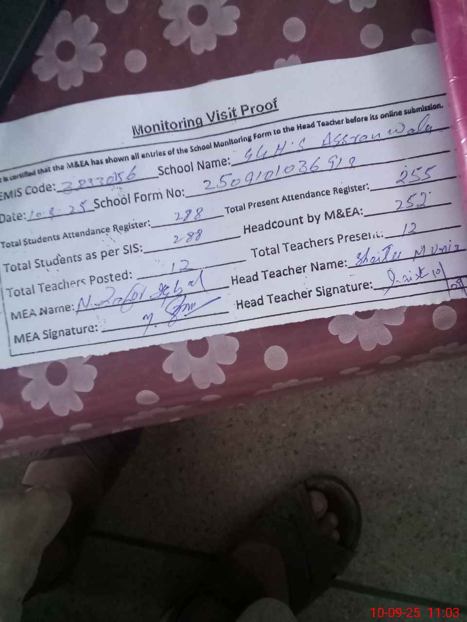 | Attendance Register | Head Teacher | MEA with School | Visit Proof |