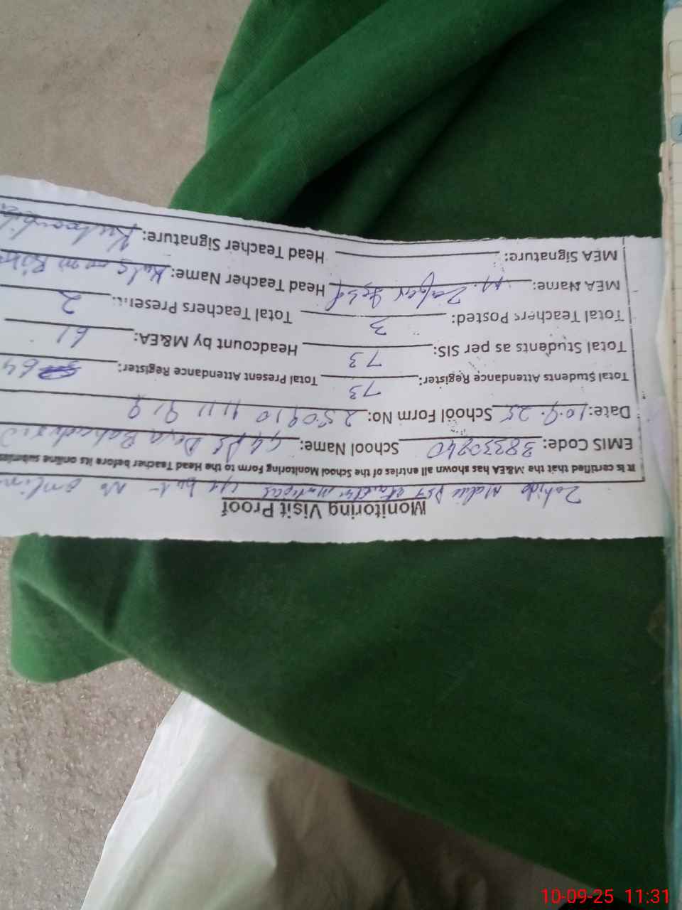 | Attendance Register | Head Teacher | MEA with School | Visit Proof |