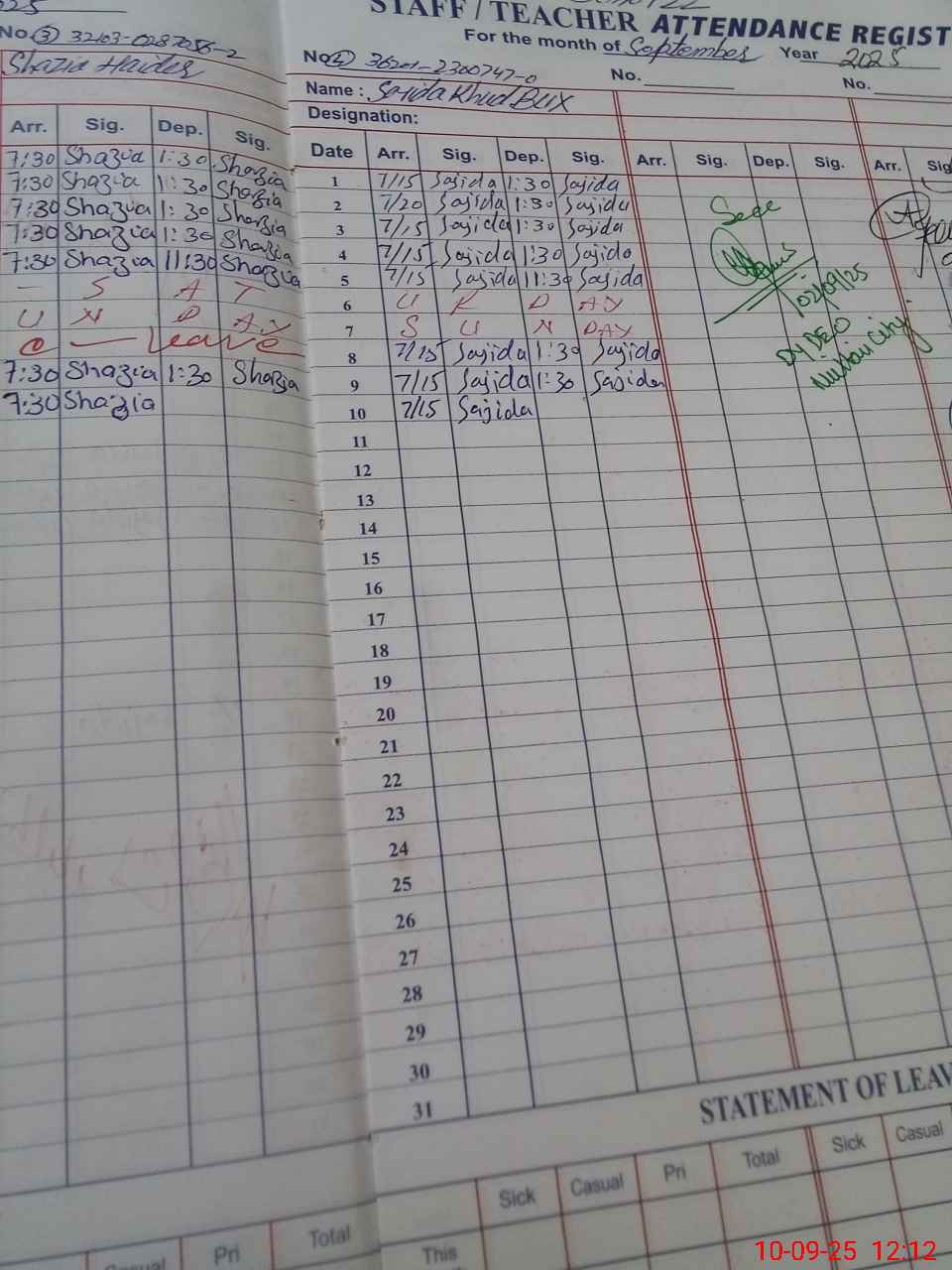 | CNIC | Full Name | Designation | R/C | Absence During Last Calender Month |
