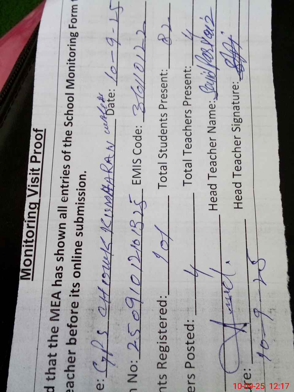 | Attendance Register | Head Teacher | MEA with School | Visit Proof |