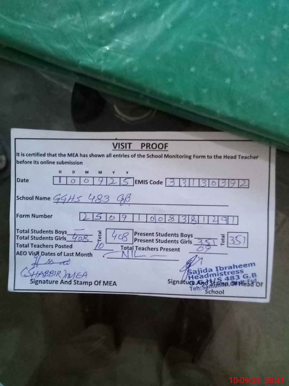 | EMIS Code: 33130392 | Name of School: GGHS CHAK NO 483 GB | |||