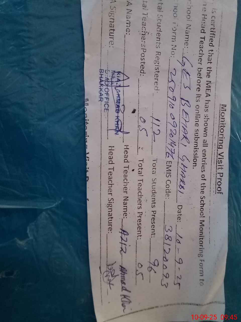 | Certified that this School was Inspected by the Undersigned MEA/DMO Today and the Information Stated Above is as Per Record. | |||||
