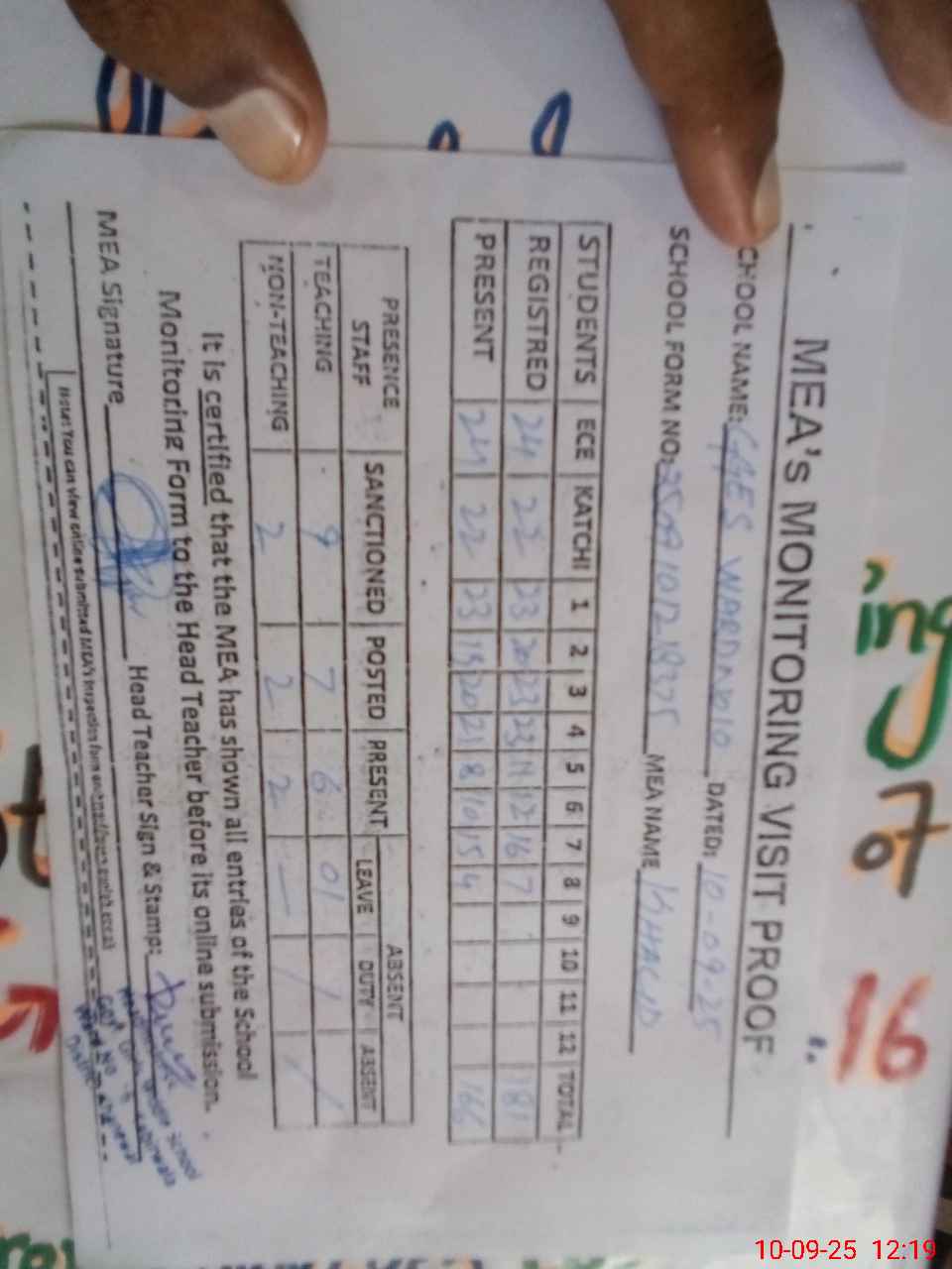 | Attendance Register | Head Teacher | MEA with School | Visit Proof |
