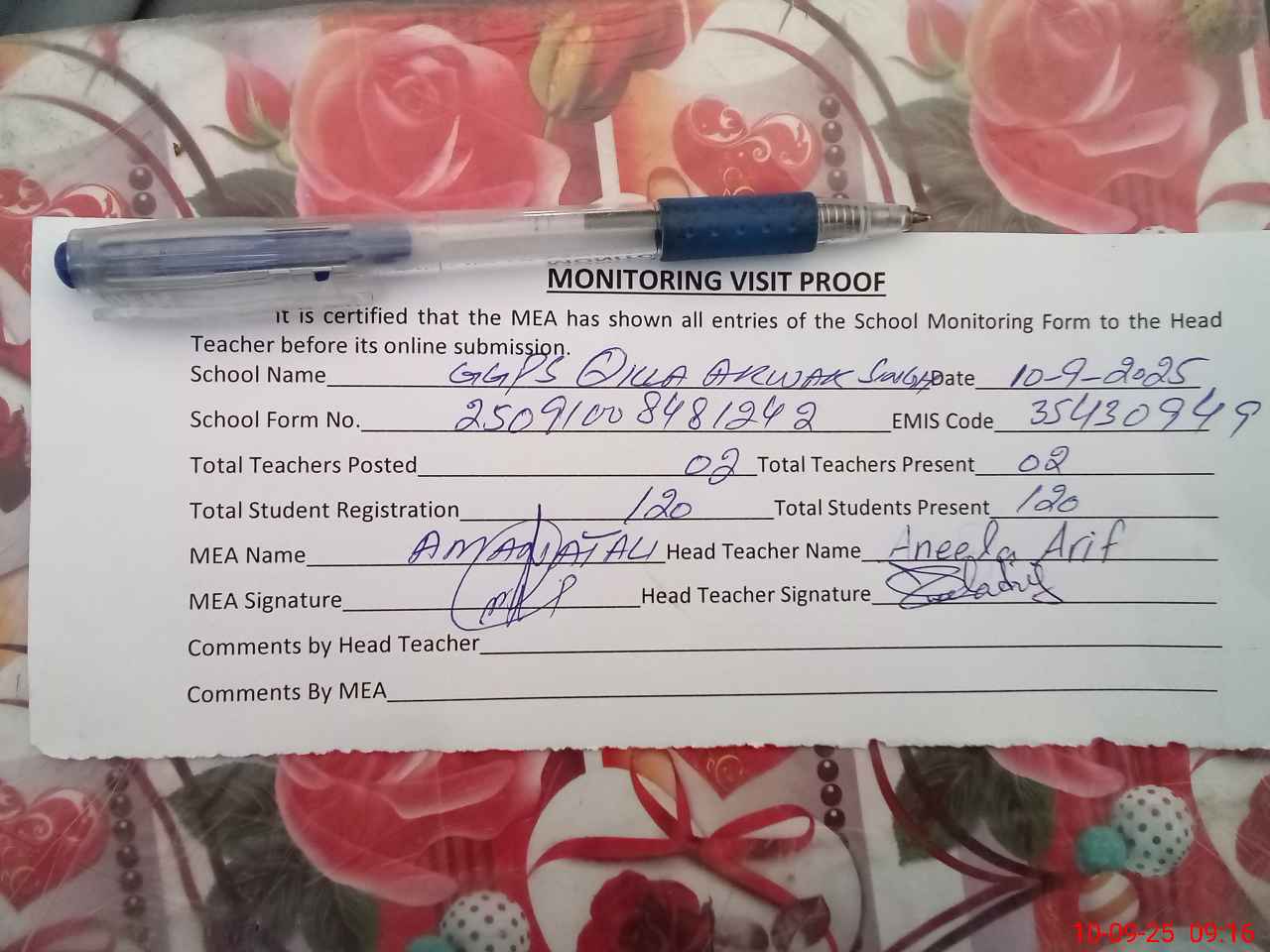 | Attendance Register | Head Teacher | MEA with School | Visit Proof |