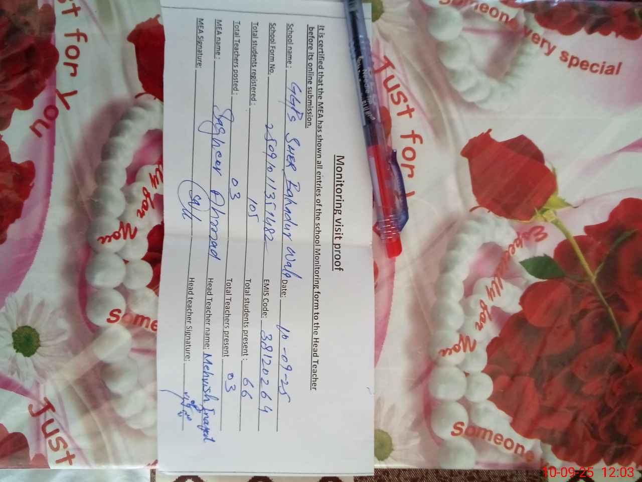 | Attendance Register | Head Teacher | MEA with School | Visit Proof |