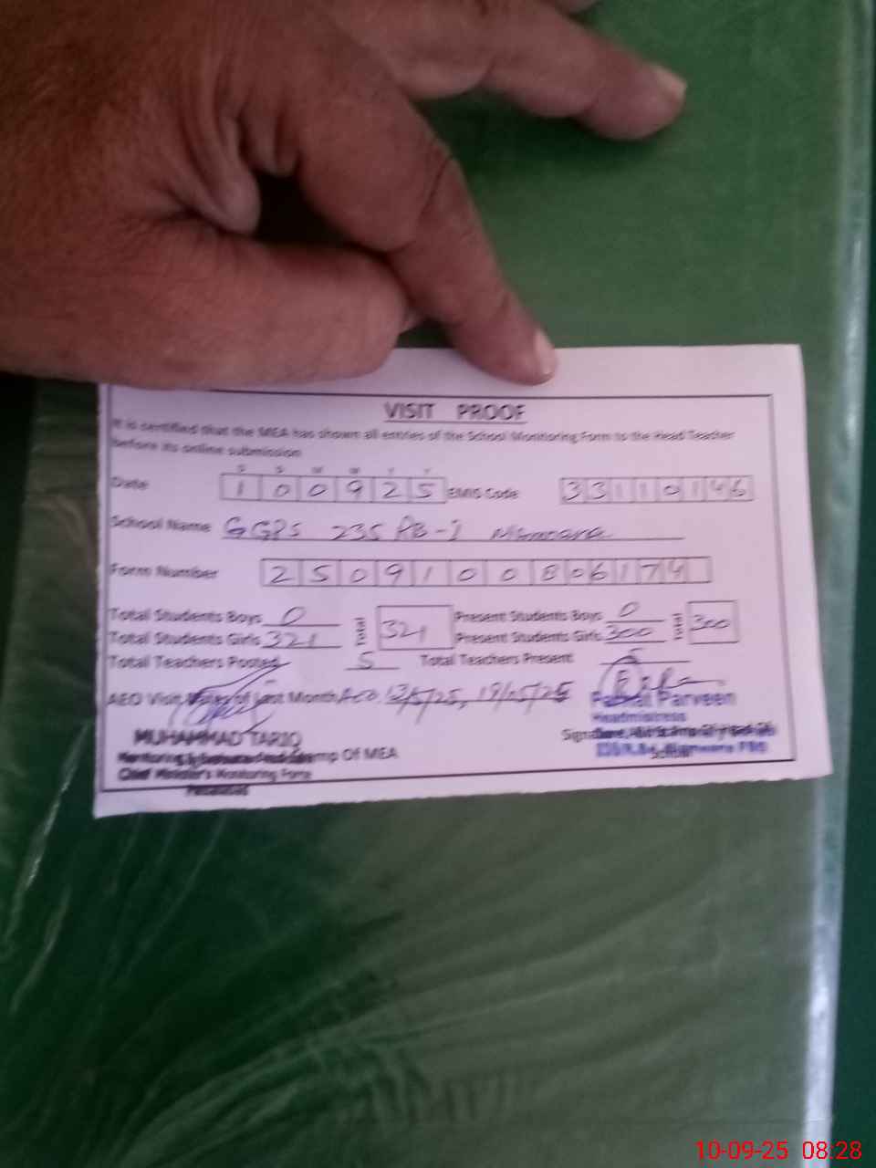 | Certified that this School was Inspected by the Undersigned MEA/DMO Today and the Information Stated Above is as Per Record. | |||||