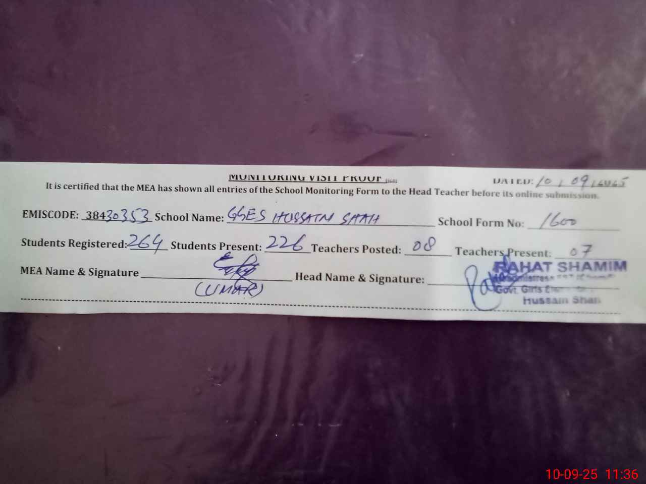 | Attendance Register | Head Teacher | MEA with School | Visit Proof |