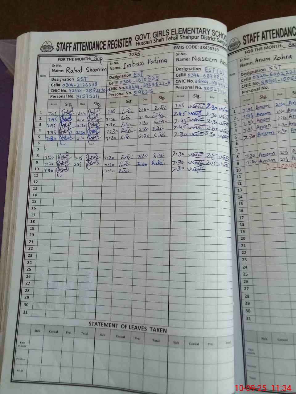 | CNIC | Full Name | Designation | R/C | Absence during last cal. month |