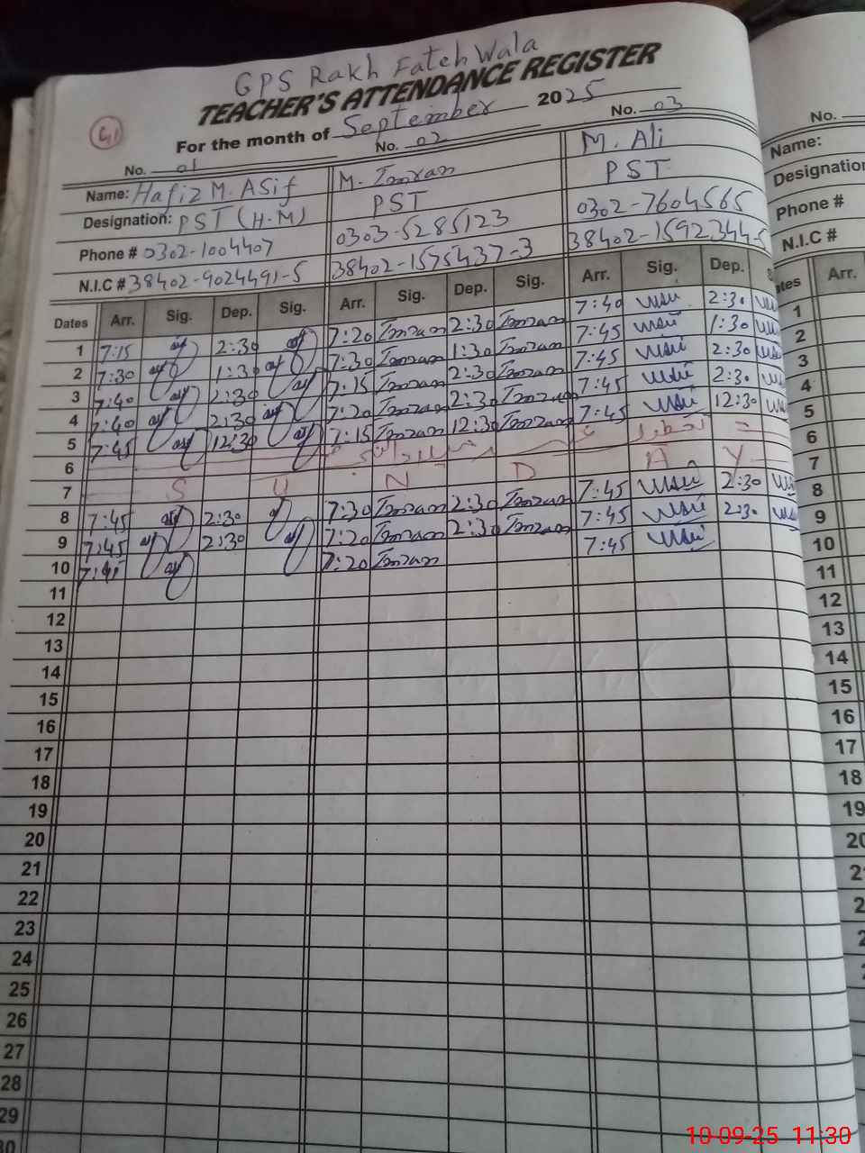 | CNIC | Full Name | Designation | R/C | Absence during last cal. month |