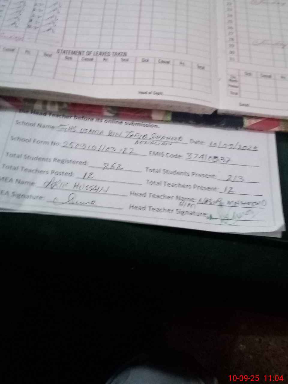 | Attendance Register | Head Teacher | MEA with School | Visit Proof |