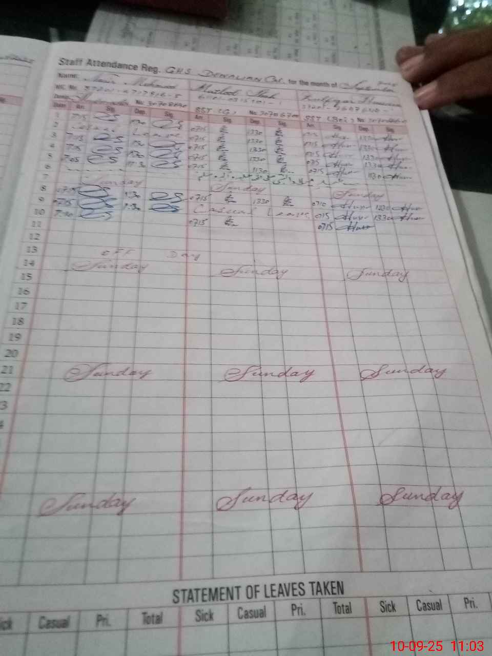 | CNIC | Full Name | Designation | R/C | Absence During Last Calender Month |