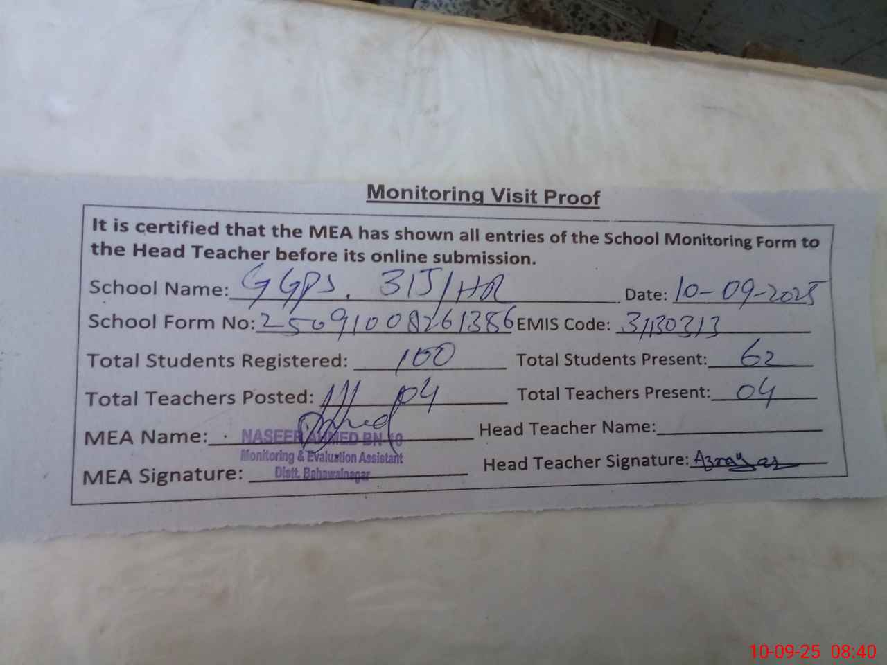 | Attendance Register | Head Teacher | MEA with School | Visit Proof |