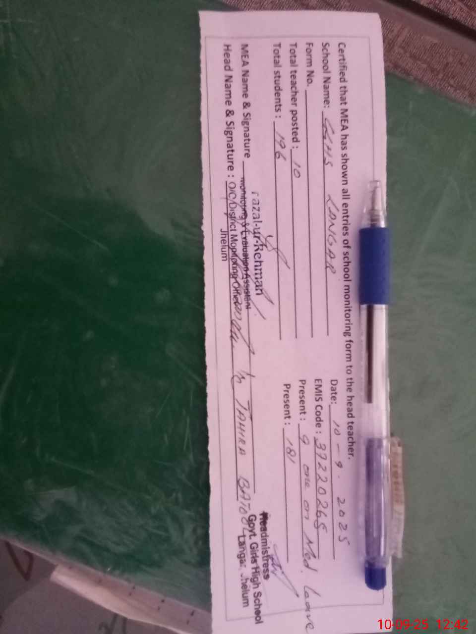 | Certified that this School was Inspected by the Undersigned MEA/DMO Today and the Information Stated Above is as Per Record. | |||||