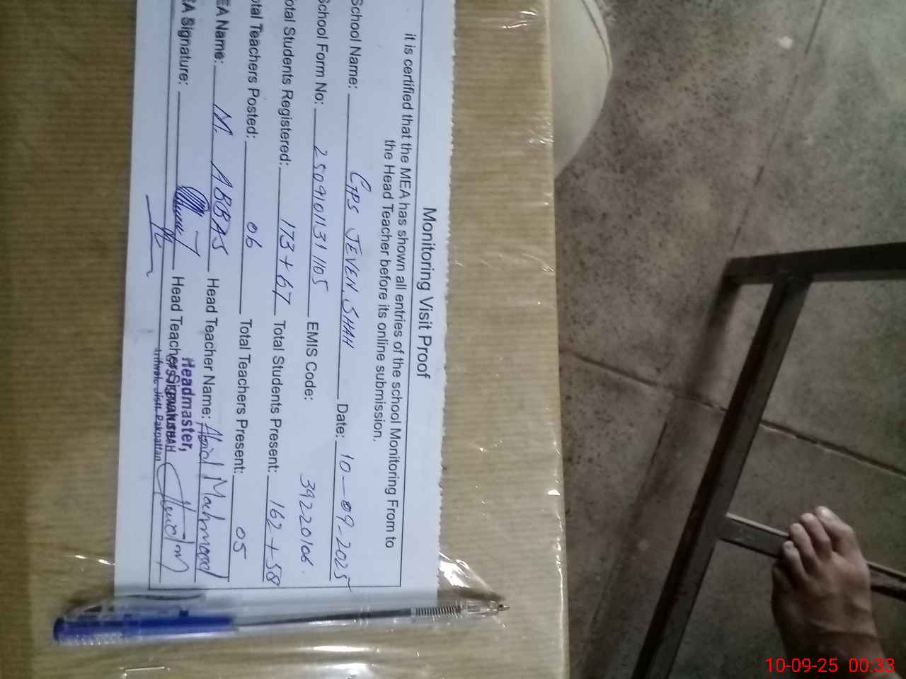| Certified that this School was Inspected by the Undersigned MEA/DMO Today and the Information Stated Above is as Per Record. | |||||