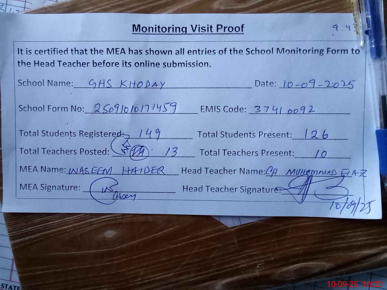 | Attendance Register | Head Teacher | MEA with School | Visit Proof |