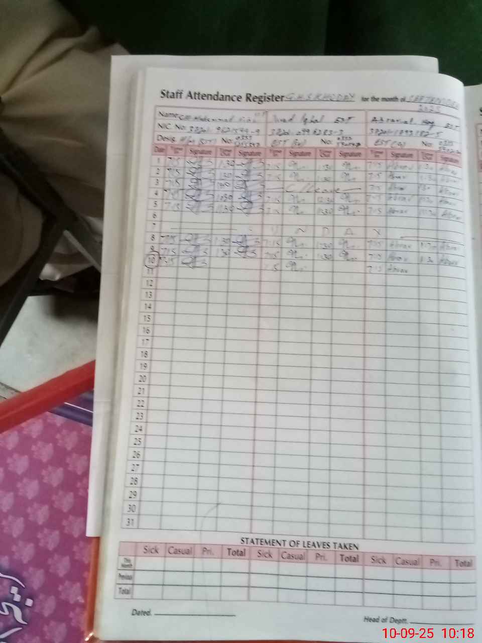 | CNIC | Full Name | Designation | R/C | Absence During Last Calender Month |