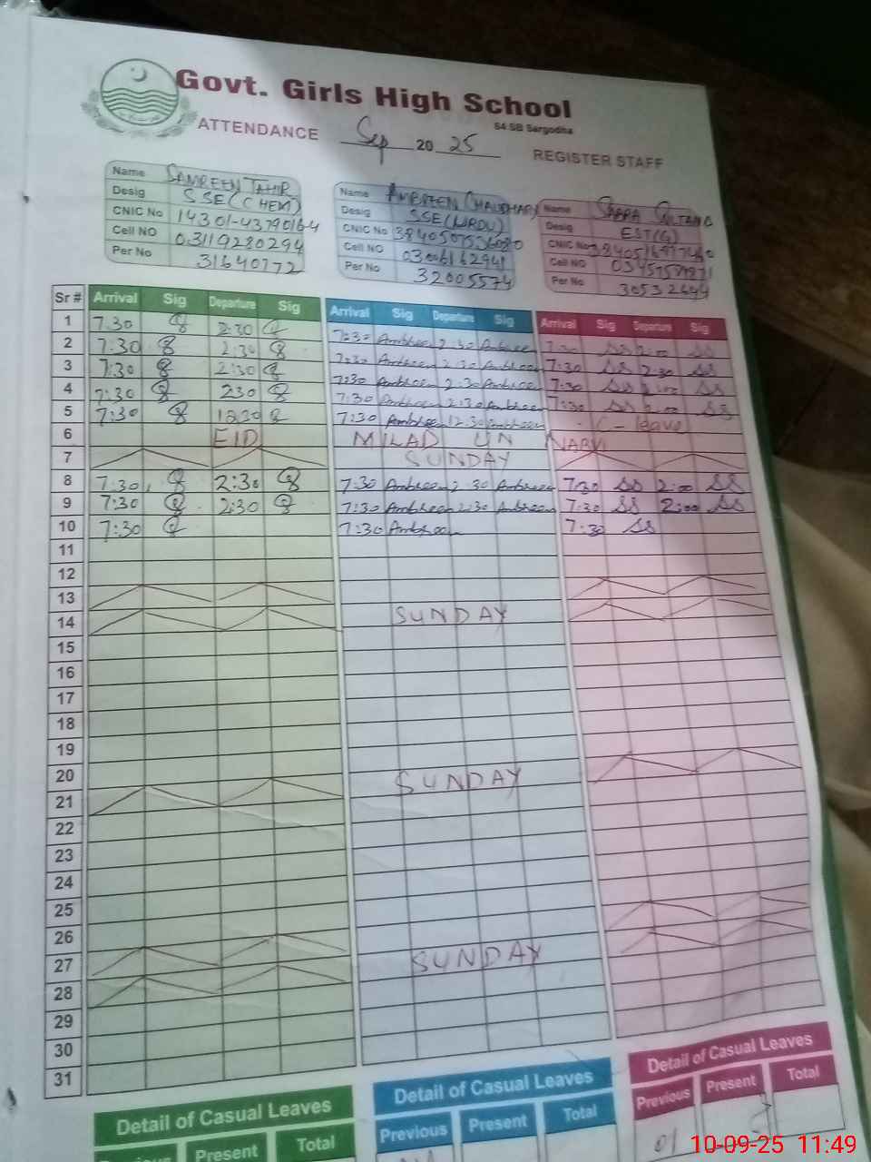| CNIC | Full Name | Designation | R/C | Absence During Last Calender Month |