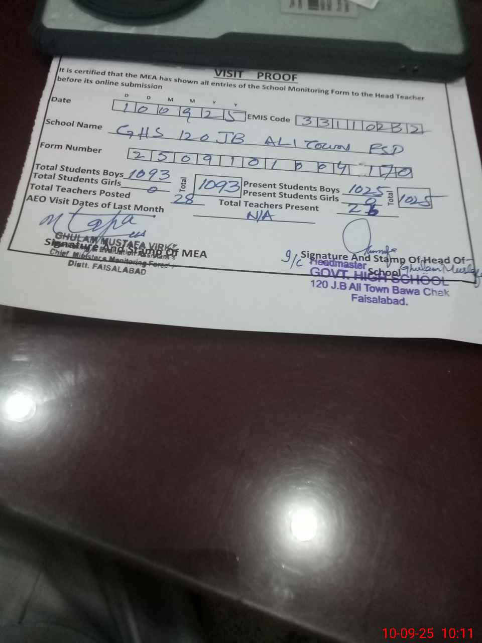 | Attendance Register | Head Teacher | MEA with School | Visit Proof |