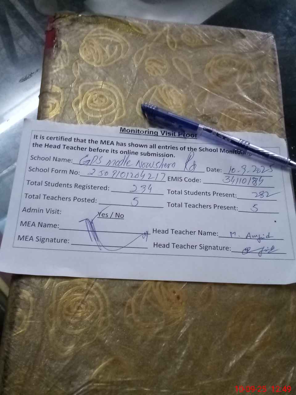 | Certified that this School was Inspected by the Undersigned MEA/DMO Today and the Information Stated Above is as Per Record. | |||||