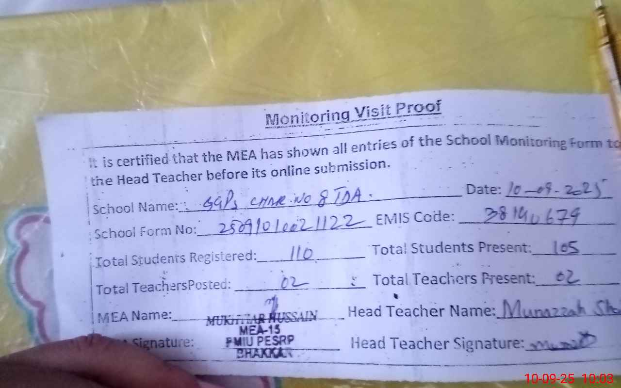 | EMIS Code: 38140679 | Name of School: GGPS CHAK NO. 8 TDA | |||
