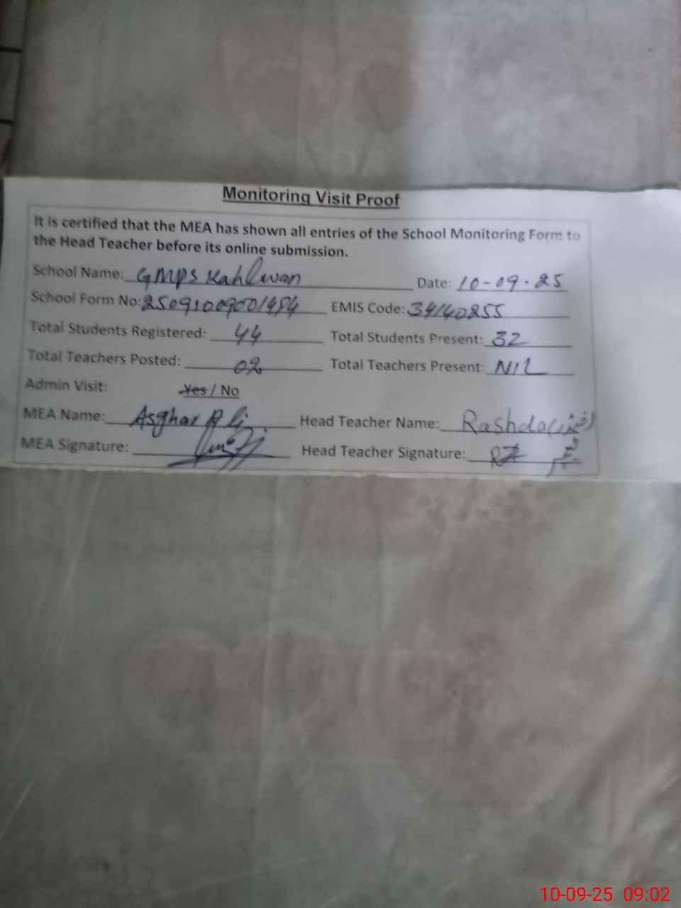 | Attendance Register | Head Teacher | MEA with School | Visit Proof |