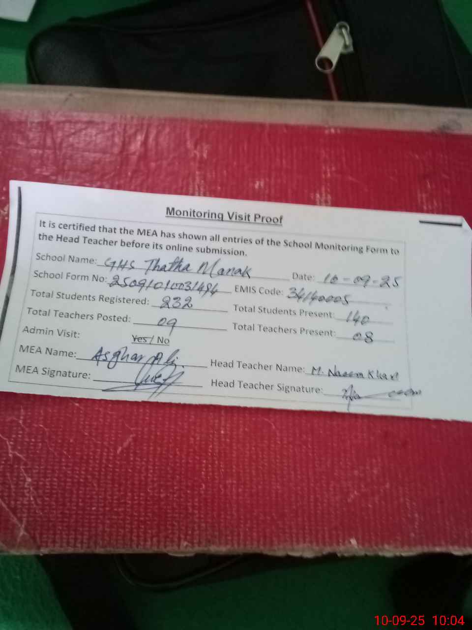 | Attendance Register | Head Teacher | MEA with School | Visit Proof |