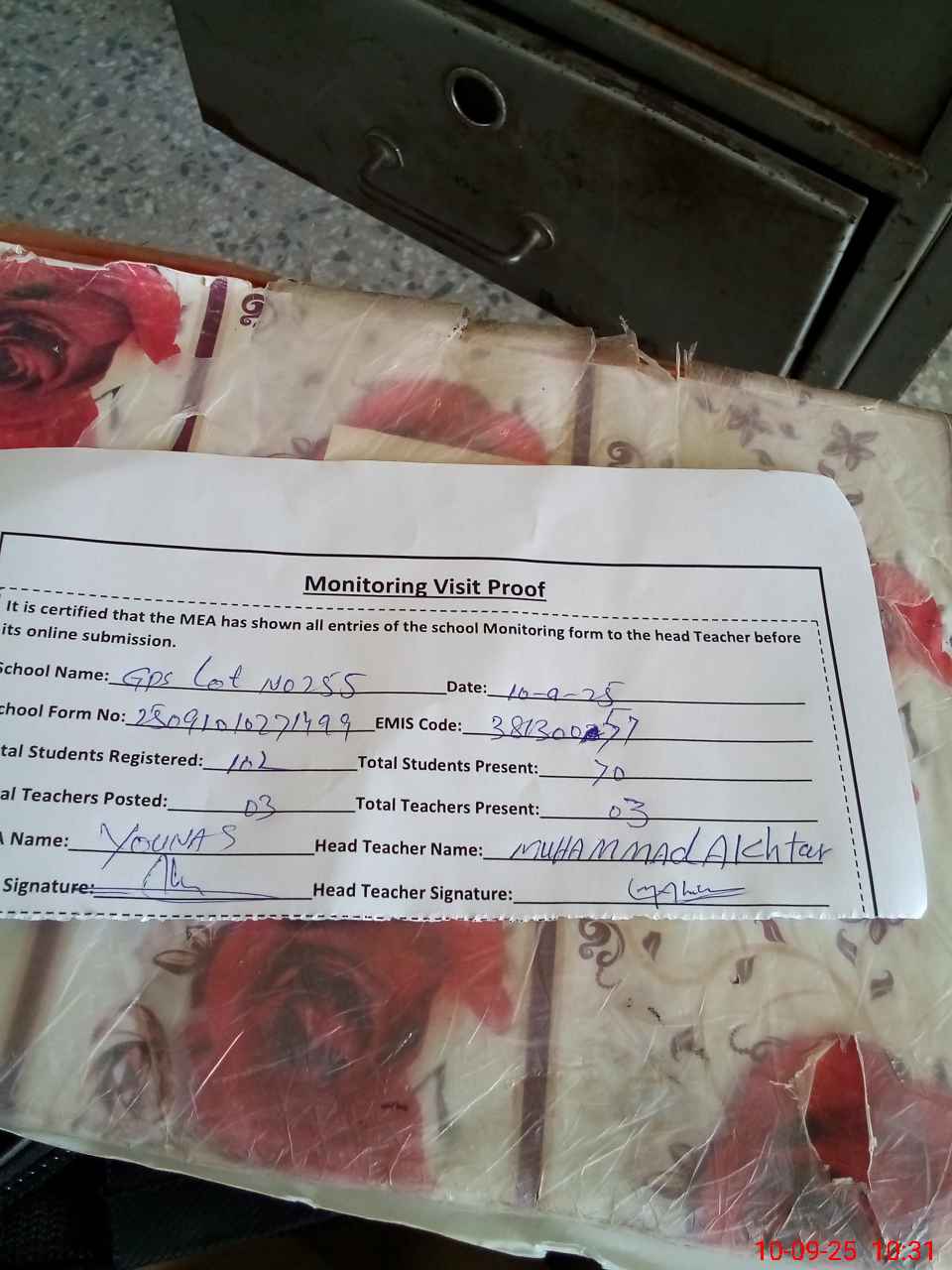 | Attendance Register | Head Teacher | MEA with School | Visit Proof |