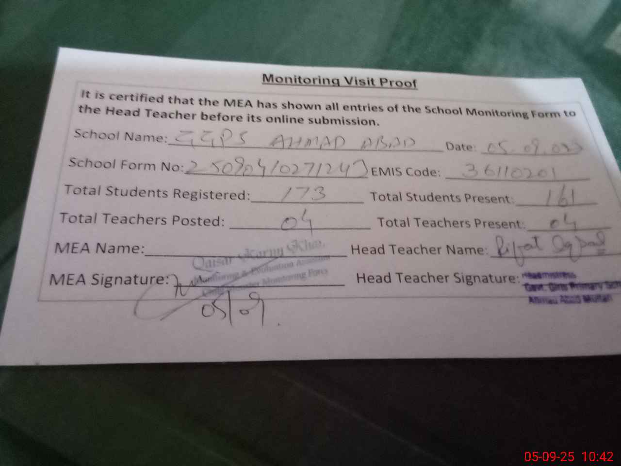 | EMIS Code: 36110201 | Name of School: GGPS AHMAD ABAD | |||