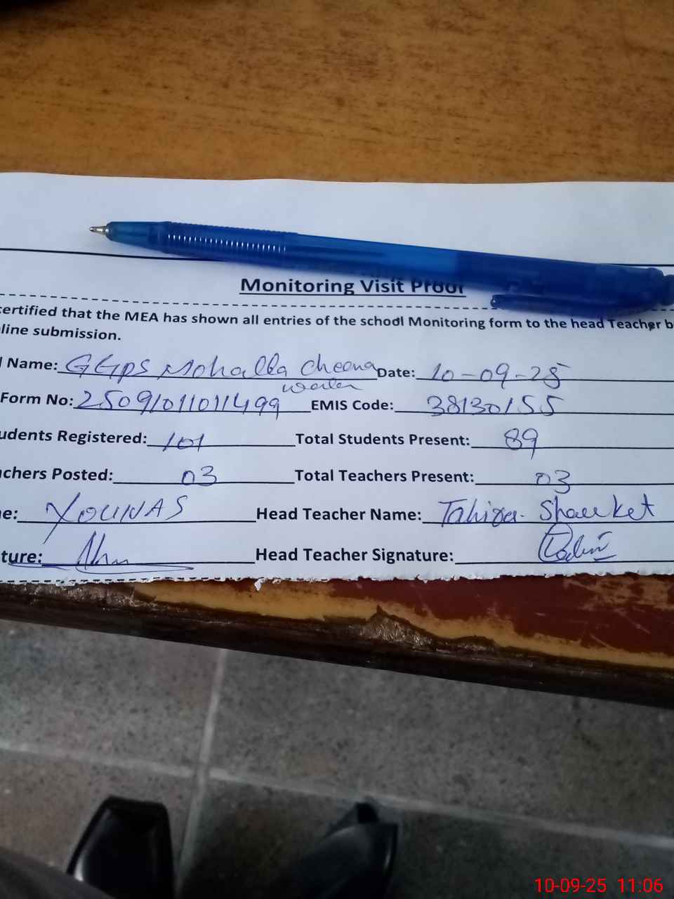 | Attendance Register | Head Teacher | MEA with School | Visit Proof |