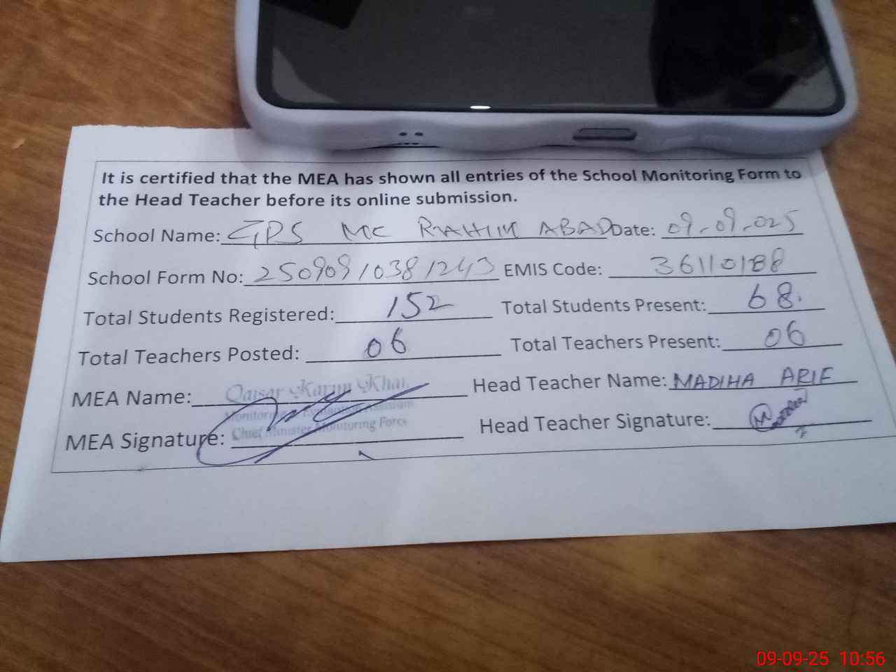 | Monitoring Date: 09-09-2025 | Start Time: 09-09-2025 10:18 AM | End Time: 09-09-2025 10:59 AM | Name of MEA: Qa**** Ka**** Kh**** | |