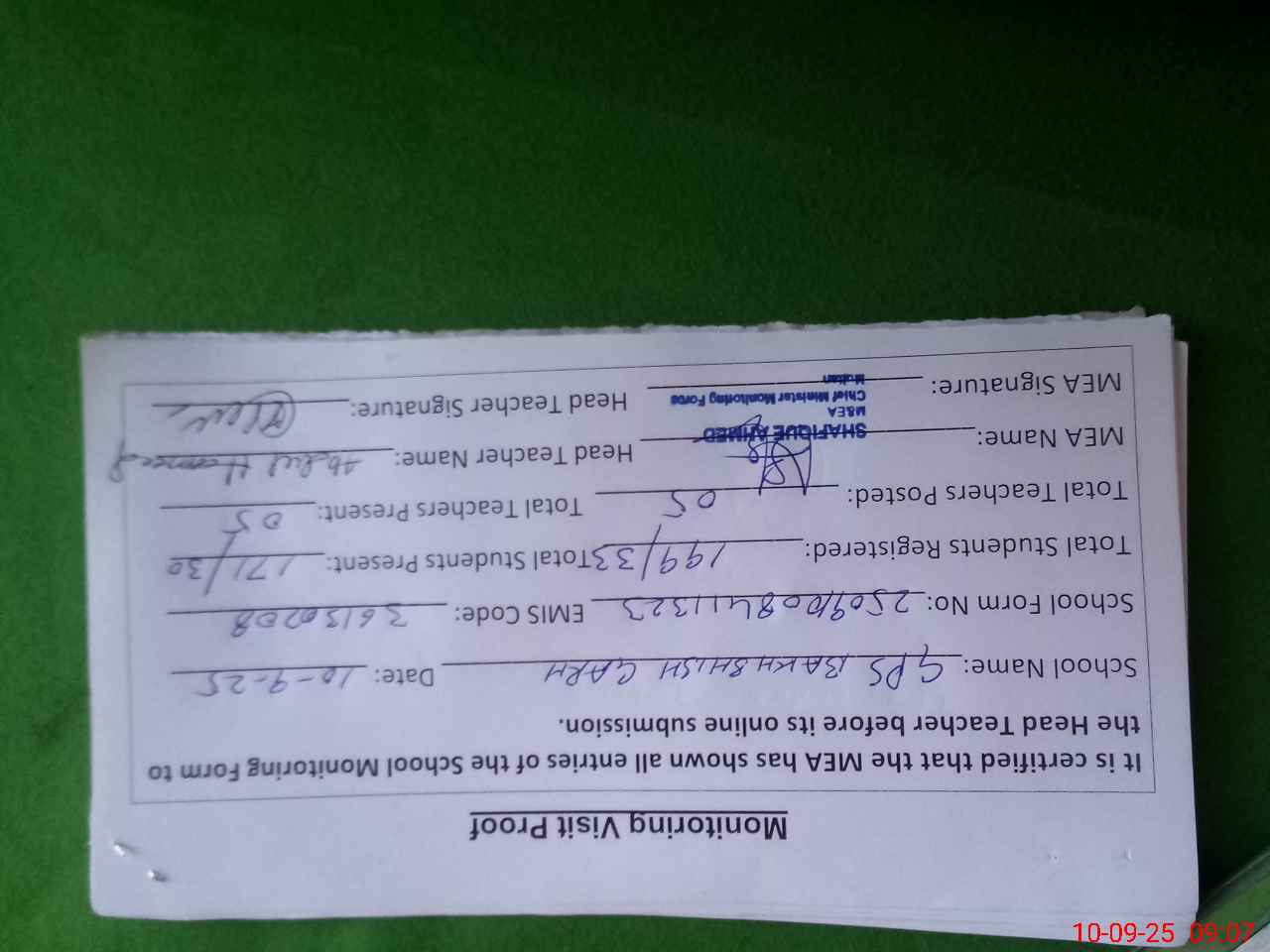 | Monitoring Date: 10-09-2025 | Start Time: 10-09-2025 08:41 AM | End Time: 10-09-2025 09:07 AM | Name of MEA: SH**** AH**** | |