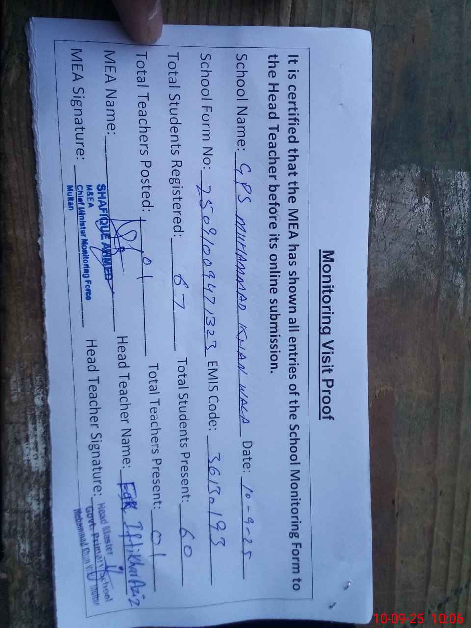 | EMIS Code: 36130193 | Name of School: GPS MUHAMMAD KHAN WALA P/O JAL WALA | |||