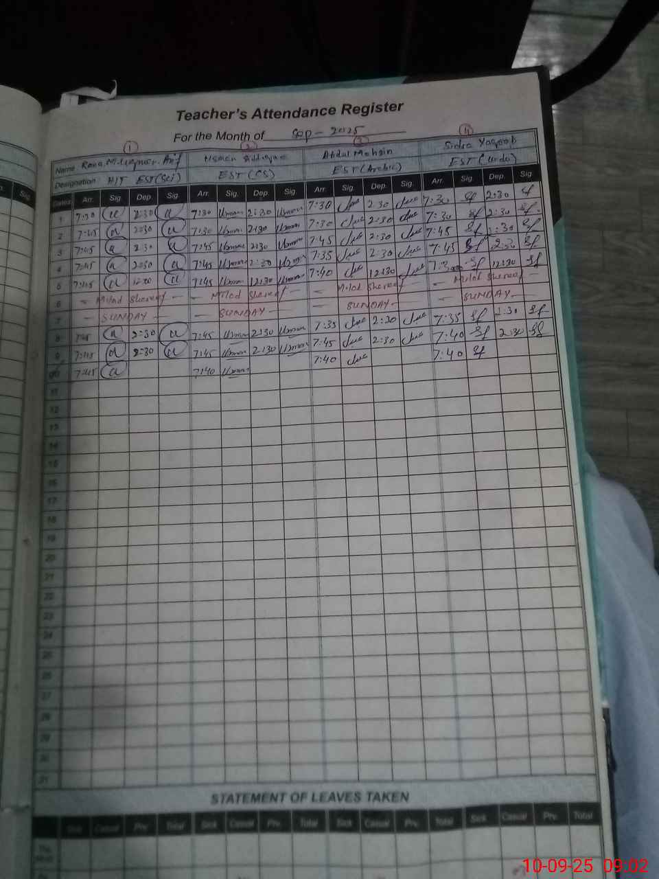 | CNIC | Full Name | Designation | R/C | Absence During Last Calender Month |